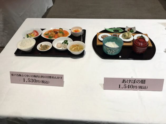 開発したのは納豆、てんぷら、ふくまるのご飯、奥久慈卵がつく「あけぼの膳」(1540円)と、ふくゆいを使った甘酢ソースと鱈(タラ)などを合わせた「水戸乃梅ふくゆいの梅肉と鱈の甘酢あんかけ…